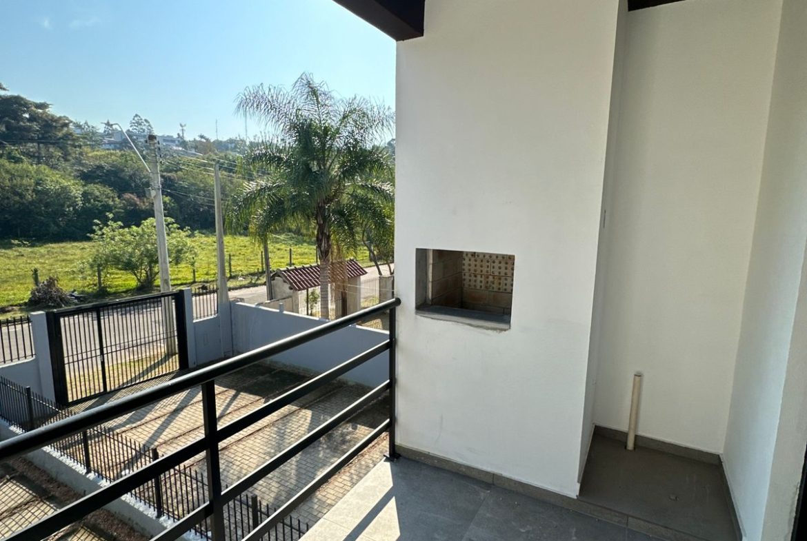 Espaçosa sacada na frente com churrasqueira.